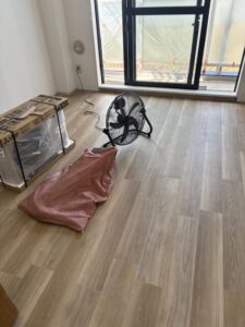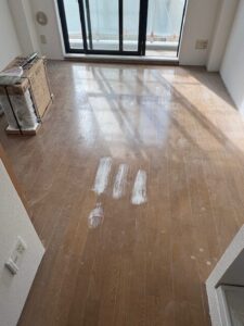 写真の現場は金曜日に工事に行った現場です。先日載せました、クロス1600㎡になります。塩ビタイルは1部屋ですが、来週から20部屋のCF・巾木工事を開始します
