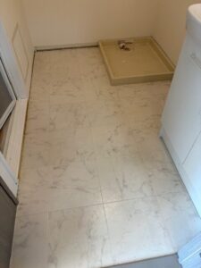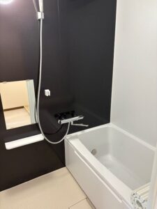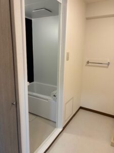 今日は市内で工事を進めています現場に来ています。昨日、ユニットバス工事が終わりましたので朝から大工さんに枠・ボード工事をお願いして、終わり次第、私がクロス・CFを貼り仕上げました。この現場も後少しで完成します。明日は日曜日ですが現場に行きます。